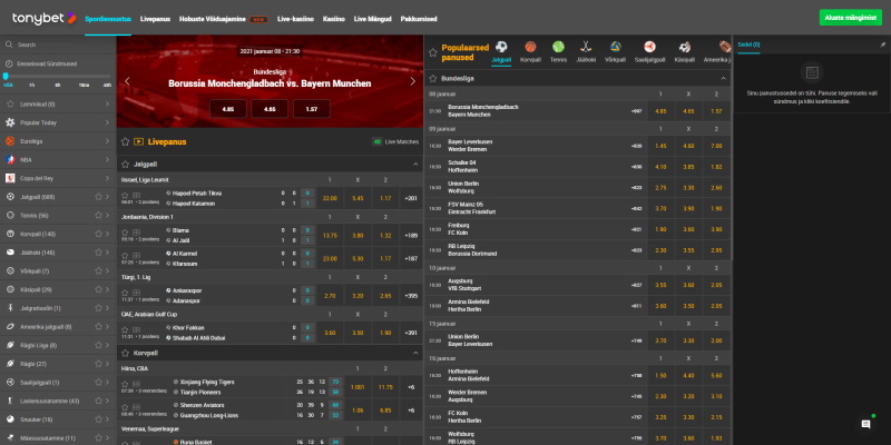 TonyBet teeb suurepärast tööd, pakkudes oma registreeritud klientidele kõikehõlmavat spordiennustust ja kasiinoteenust Nagu arvata võib, on mobiiliversioonis olemas kõik kõige populaarsemad spordialad, sealhulgas jalgpall, hobuste võiduajamine, korvpall ja noolemäng.
